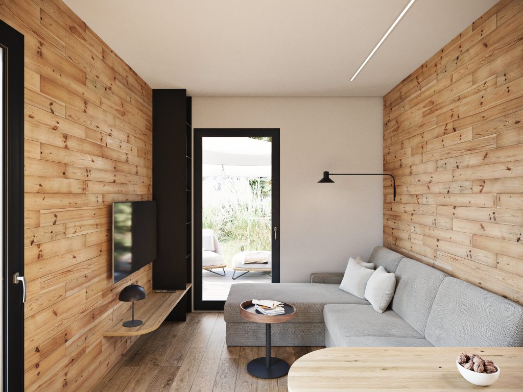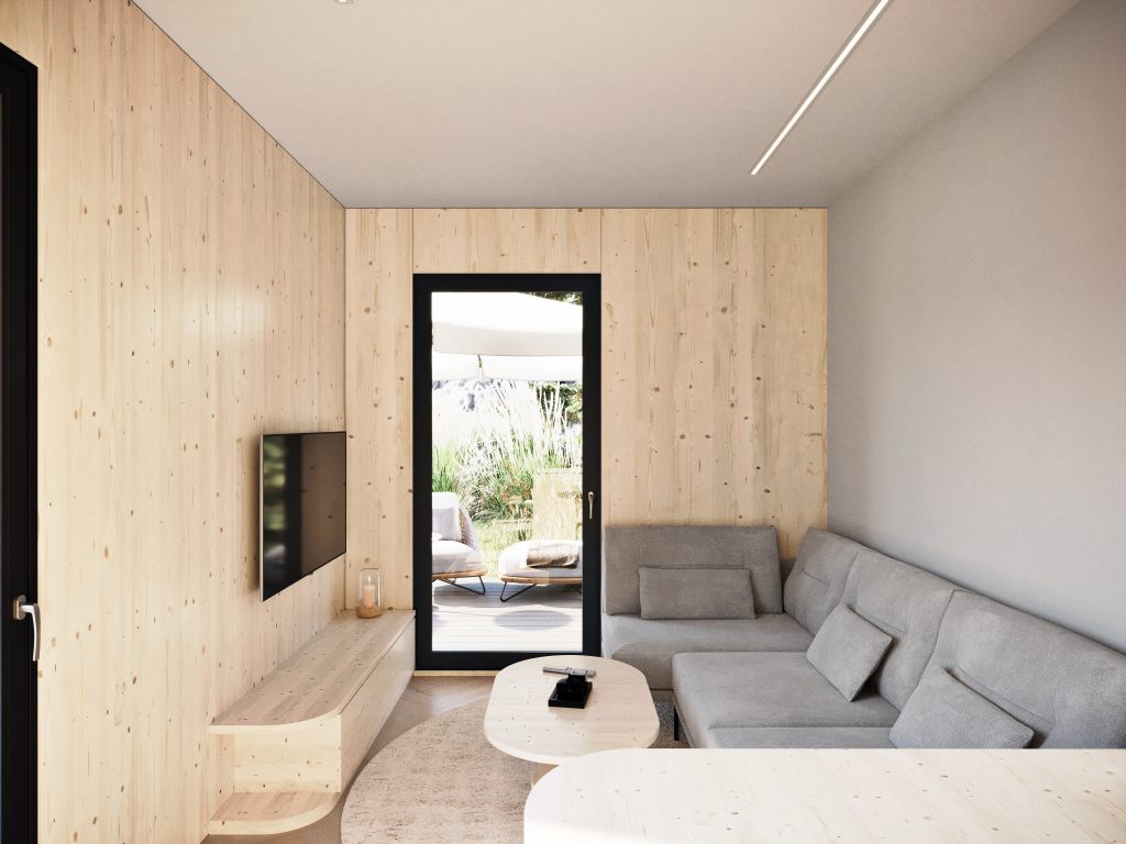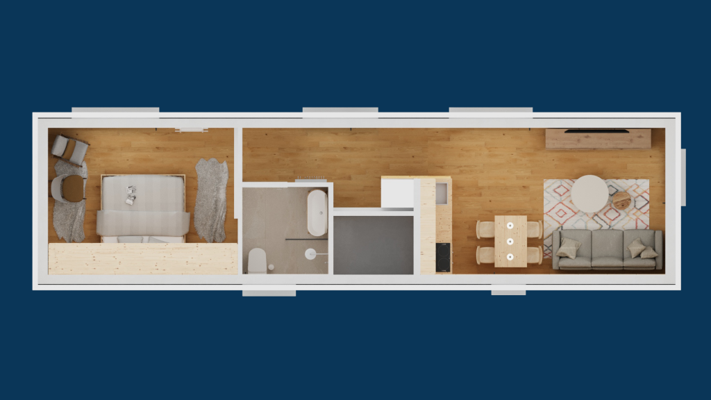 Möglichkeit des Innenausbaus und der Anordnung mit der Verwendung verschiedener langlebiger, ästhetischer und pflegeleichter Materialien wie z.B. Putz, Holzplatten, Bretter, Verkleidung, Paneele, Parkett, Keramikfliesen. Das Modul in jeder Version haben ein voll ausgestattetes Bad und eine Küche, es gibt 2 Standards Basis – Premium und natürlich individuell nach Kundenwunsch.